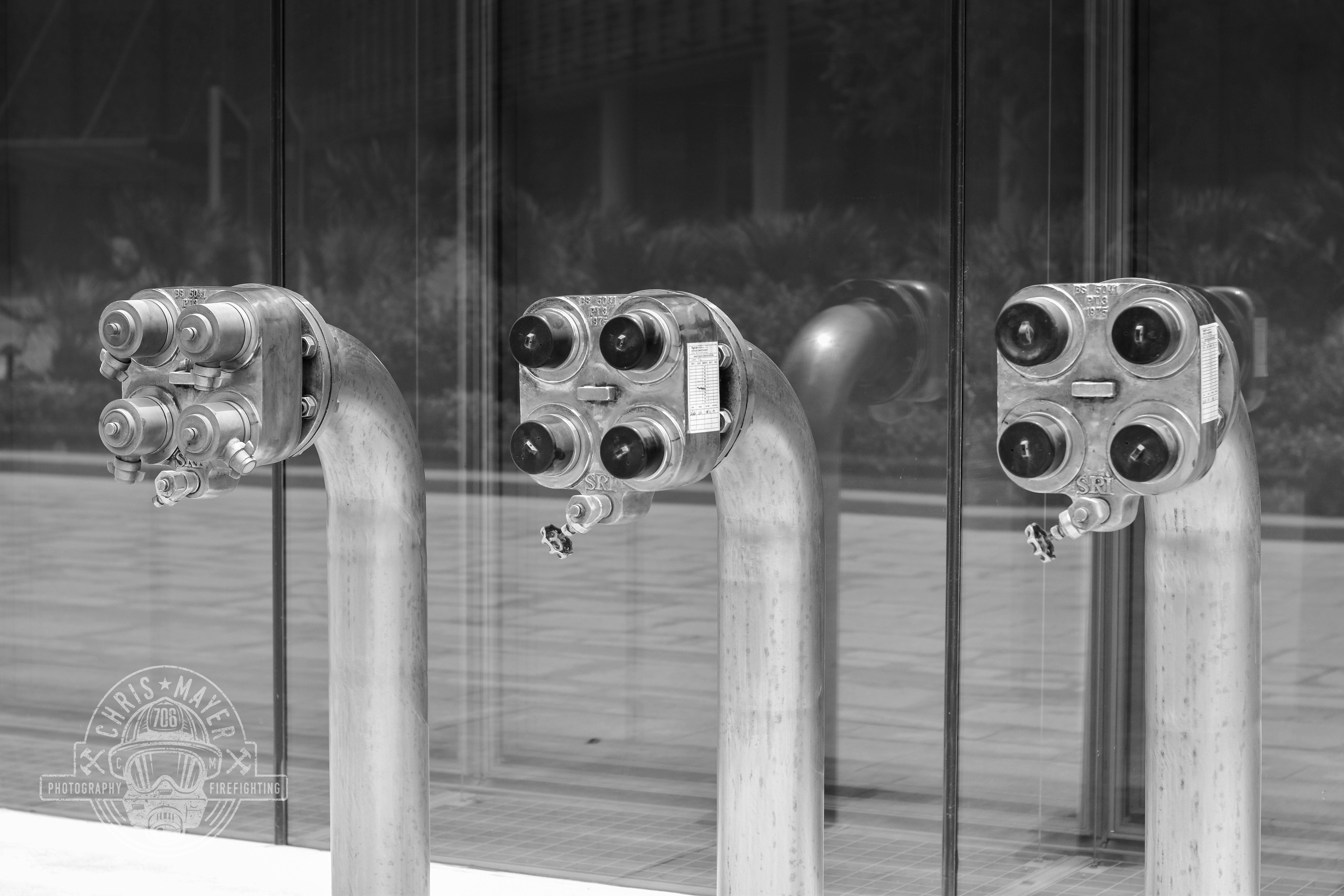 Wieder mal ein kleiner Schwenker zum Thema vorbeugender Brandschutz & Löscheinrichtungen. Auf dem Bild sind drei Einspeisungen zu sehen an der Außenfassade eines Hochhauses in Abu Dhabi. Hier wurde dem Gebäude entsprechend geplant und man kann mit zwölf 2 1/2 Inch Schläuchen (B-Schläuche) in die Trockensteigleitung des Gebäudes einspeisen. Wie sind diese Sammelstücke konstruiert? Hinter jedem Anschluss der jeweils 4 männlichen Kupplungen steckt eine Rückschlagklappe, die bei Druckverlust, Zusammenbruch der Wasserversorgung oder einfach bei abkupplung der Schläuche dafür sorgt, dass im Gebäude die Wassersäule nicht zusammenbricht und die Leitung gefüllt bleibt.